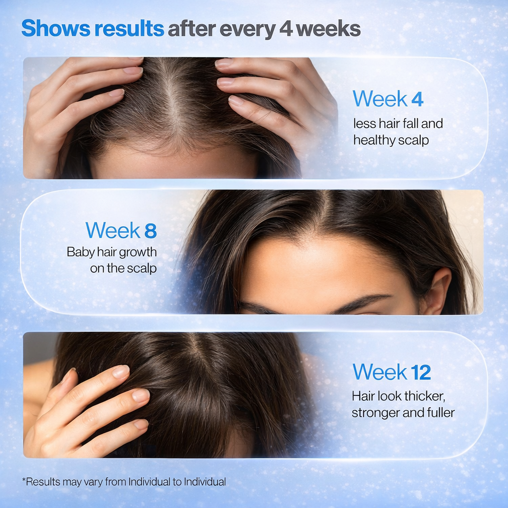 Most users notice improvements in scalp comfort and reduced shedding within 4 weeks. Fuller-looking hair typically appears with 8–12 weeks of consistent use. Results vary based on individual hair cycles.